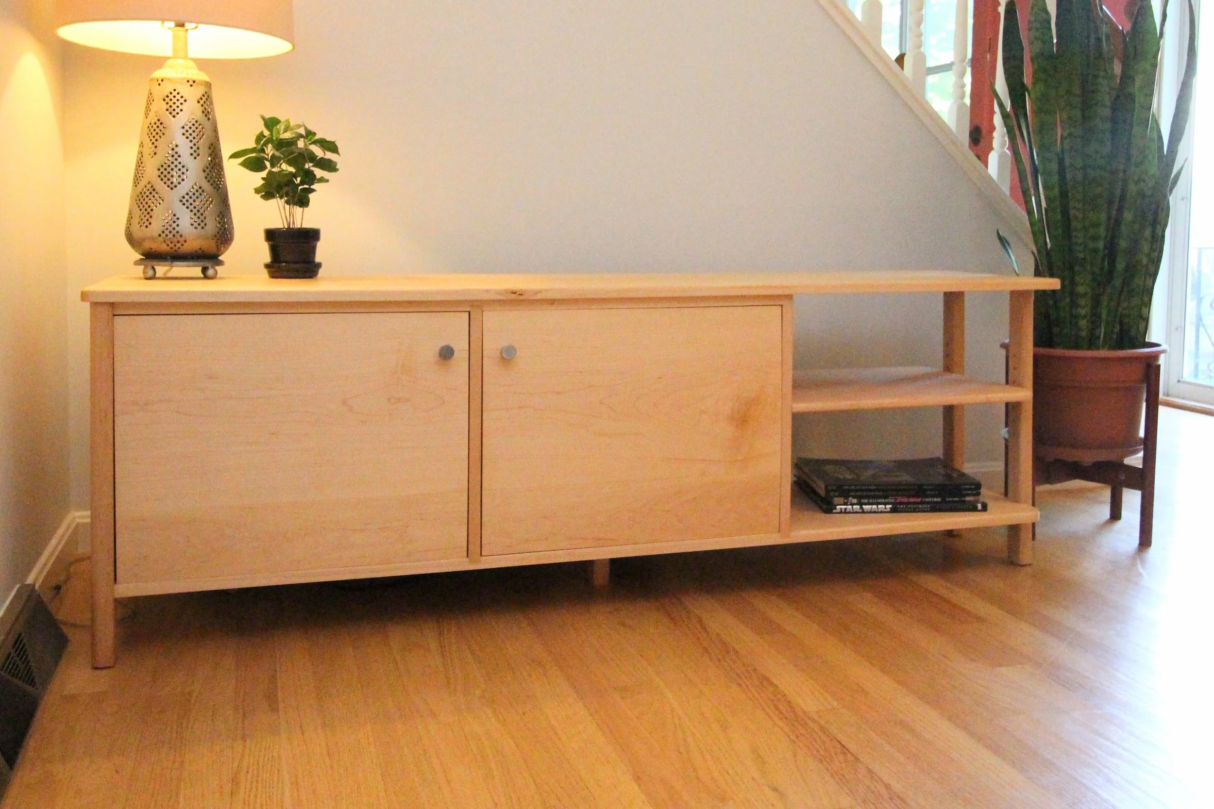 Matching cabinets conceal storage for a SNES, NES, XBox 360, PS2, and N64, but there’s probably space inside there for a few more acronyms. The asymmetrical design adds some visual flair and complements the slope of the knee-wall it sits against. The choice of maple gives a light and airy feel to what otherwise is a dark corner of the room.