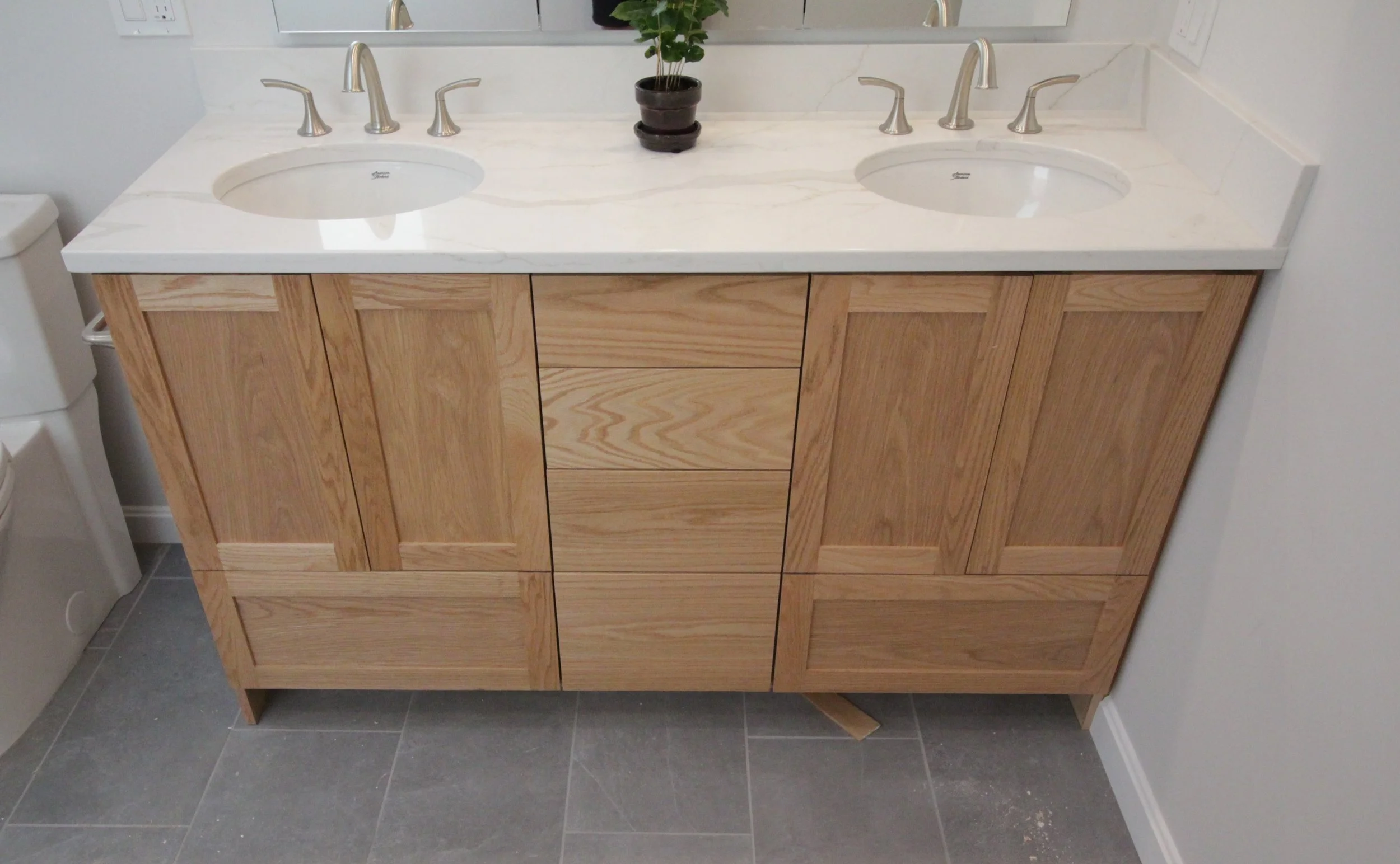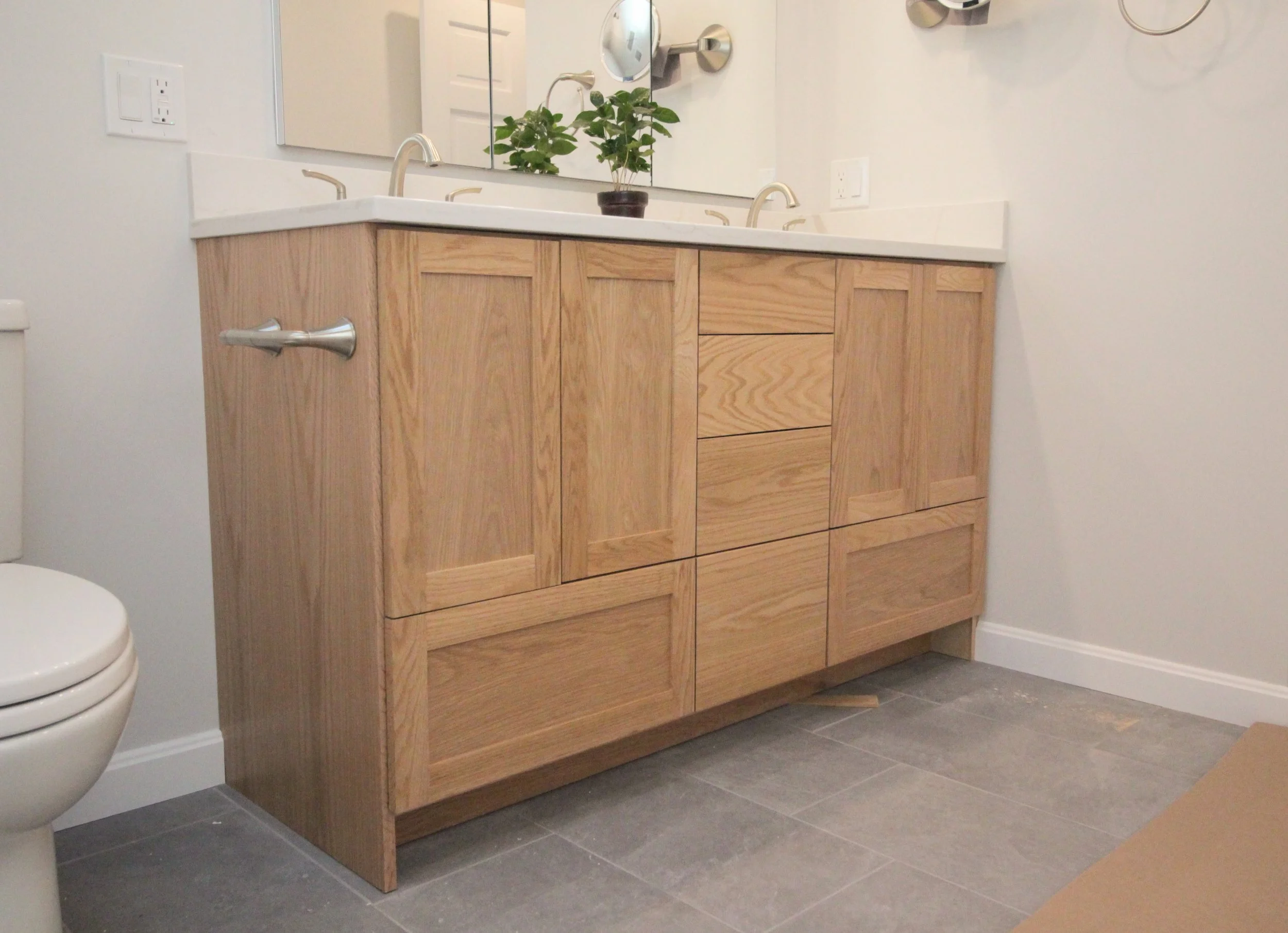 We wrapped up this solid red oak vanity finished in water-based polyurethane in mid-2024. This was part of a larger residential addition we worked on in Beverly Cove.